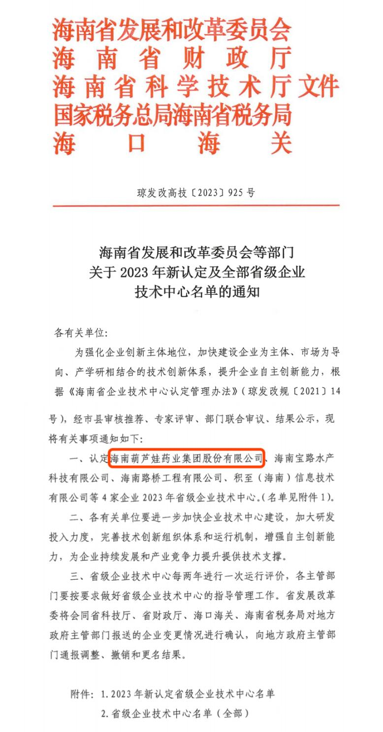 近日,海南省发改委等多部门联合公布了《关于2023年新认定及全部省级企业技术中心名单的通知》,其中,海南开云电竞药业集团股份有限公司成功通过评审,被认定为省级企业技术中心,是本次获批的4家企业之一。